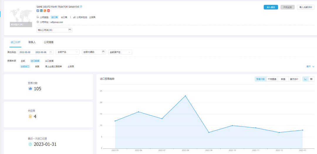 PA视讯国际外贸通能够一键查询和追踪某类产品的全球交易详情,并体现整个供应链的采购供应,最大程度展示整个贸易网的情况,基于交易数据的统计分析,多维度分析行业、产品市场趋势,助力企业洞察市场变化、把握不同市场采购淡旺季,从而准确定位目标市场。