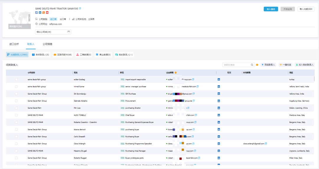 不用费时费力多渠道查找,PA视讯国际外贸通集合关键决策人的职务、邮箱、领英、Facebook等信息,可直接链接领英等世界主流社交媒体平台,帮助企业快速和目标对象建立联系,助力客户开发。